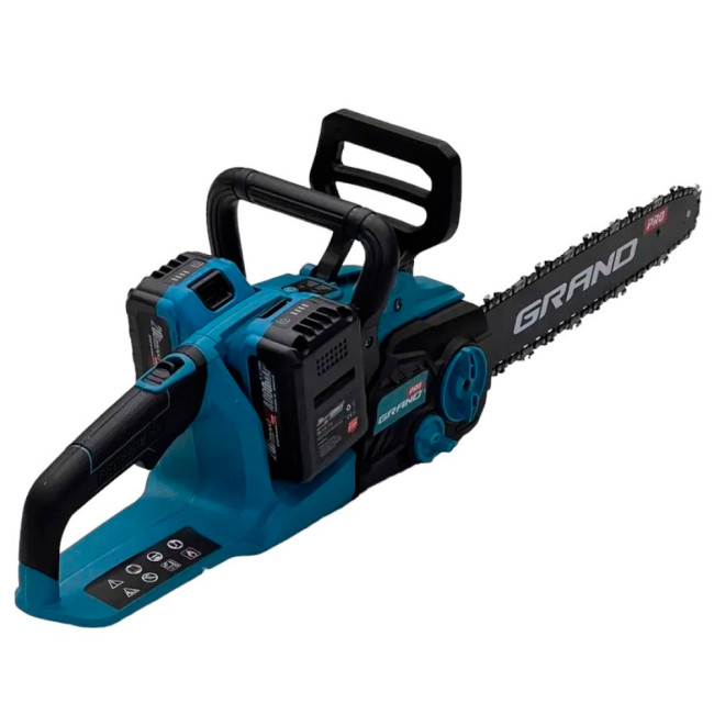 Акумуляторна ланцюгова пилка Grand АПЦ-40V BL працює від літій-іонного акумулятора, для роботи необхідно встановлювати 2 батареї одночасно, при цьому напруга становить 40 В, ємність 4,0 Ач. Акумулятори оснащені індикатором заряджання. Зарядний пристрій має світлодіод який повідомляє про стадію зарядки.