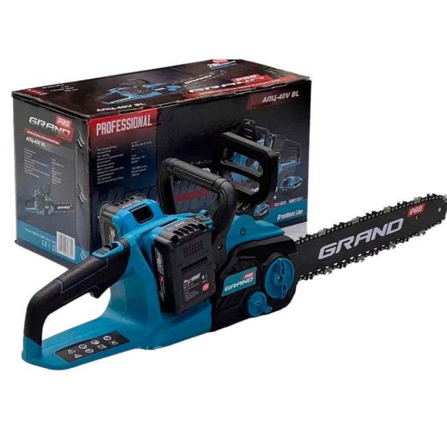 Акумуляторна елекропила Grand АПЦ-40V BL оснащена стандартною шиною довжина якої 40 см, призначена для відрізних робіт по малому та середньому діаметру деревини. Висока швидкість обертання ланцюга досягає 720-900 м/хв. забезпечує високу ефективність роботи.