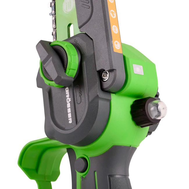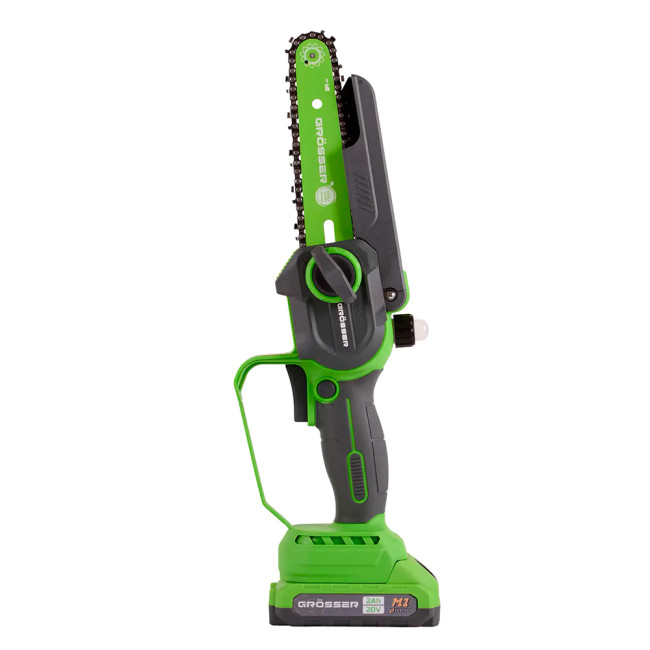 Акумуляторна пилка ланцюгова від торгової марки «Grosser» використовується для обрізання дерев та видалення сухих гілок на присадибній ділянці, як ріжучий елемент застосовується напрямна шина довжиною 6 дюймів (152 мм) та ланцюг (крок 1/4).