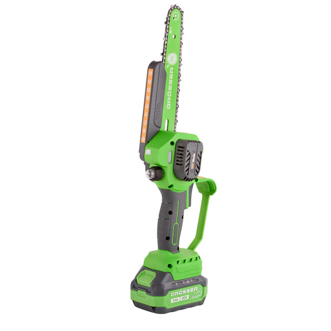 Акумуляторна пилка ланцюгова Grosser призначена для обрізання дерев та видалення сухих гілок на присадибній ділянці, як ріжучий елемент застосовується напрямна шина довжиною 8 дюймів (200 мм) і ланцюг на 46 ланок крок 1/4.
