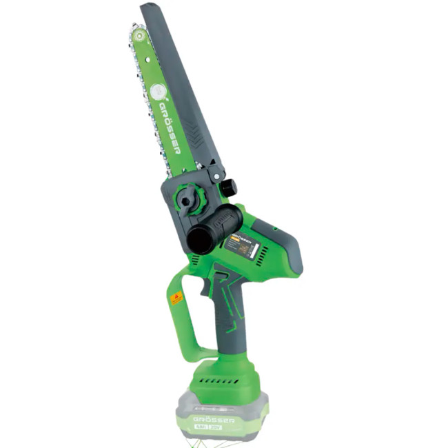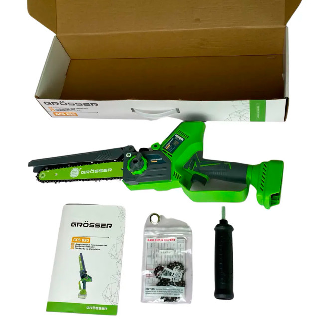 Акумуляторна пилка ланцюгова Grosser призначена для обрізання дерев та видалення сухих гілок на присадибній ділянці, як ріжучий елемент застосовується напрямна шина довжиною 8 дюймів (200 мм) і ланцюг на 47 ланок крок 1/4.