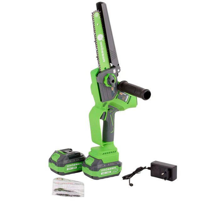 Акумуляторна пилка ланцюгова Grosser призначена для обрізання дерев та видалення сухих гілок на присадибній ділянці, як ріжучий елемент застосовується напрямна шина довжиною 8 дюймів (200 мм) і ланцюг на 47 ланок крок 1/4.