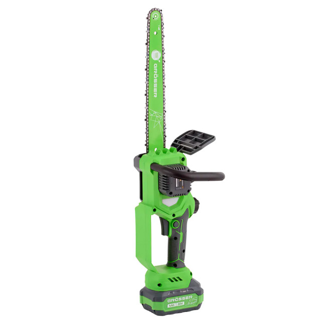 Акумуляторна ланцюгова пилка від торгової марки «Grosser» використовується для розпилу деревини, як ріжучий елемент застосовується напрямна шина довжиною 12 дюймів (305 мм) і ланцюг (крок 1/4).