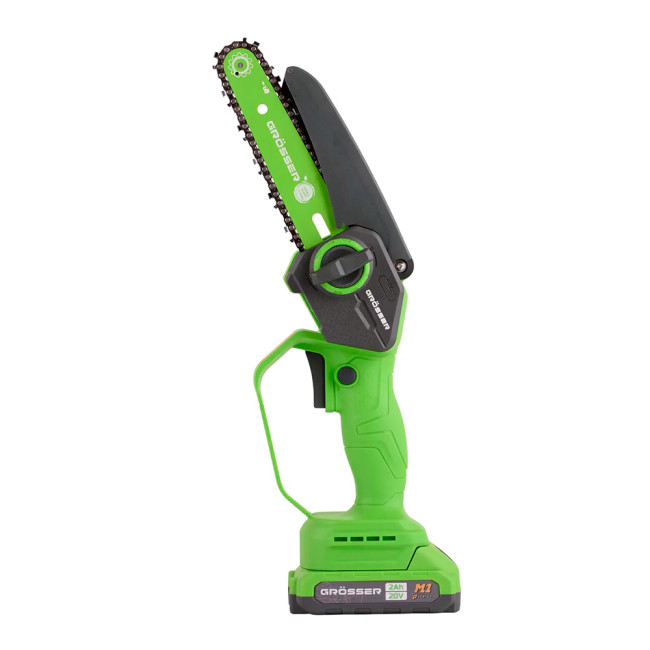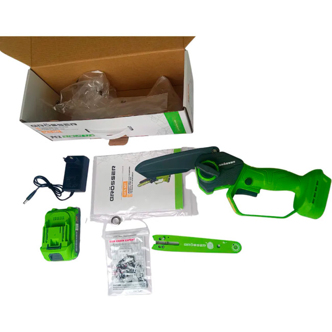 Акумуляторна пилка ланцюгова від торгової марки «Grosser» використовується для обрізання дерев та видалення сухих гілок на присадибній ділянці, як ріжучий елемент застосовується напрямна шина довжиною 6 дюймів (152 мм) та ланцюг (крок 1/4).