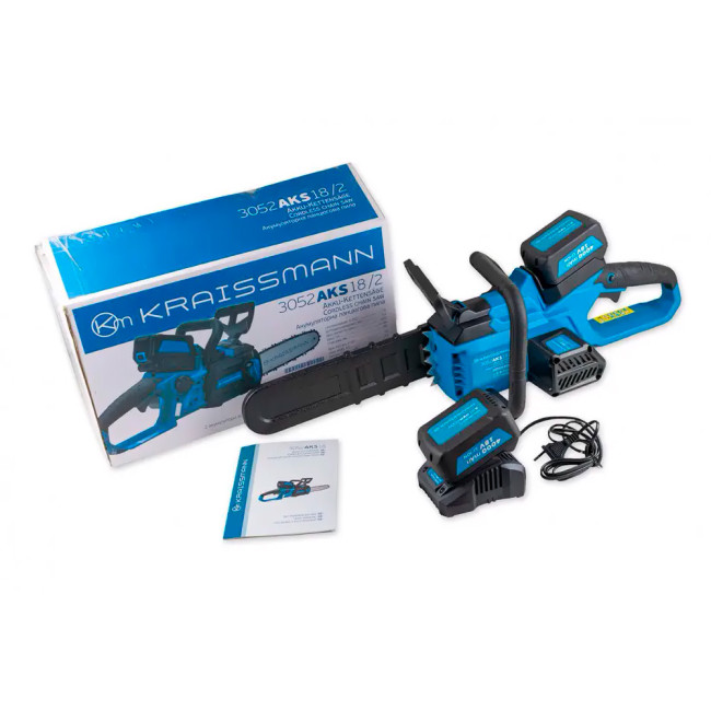 Акумуляторна пилка Kraissmann 3052 AKS 18/2 поставляється в комплекті з двома батареями та зарядним пристроєм. Напруга акумулятора становить 18 Вольт при цьому ємність дорівнює 4000 м/Ач, швидкий час зарядки (1 година) дозволить Вам завжди бути готовим до роботи, адже поки Ви працюєте електричною пилкою, друга батарея заряджається і завжди готова до використання.
