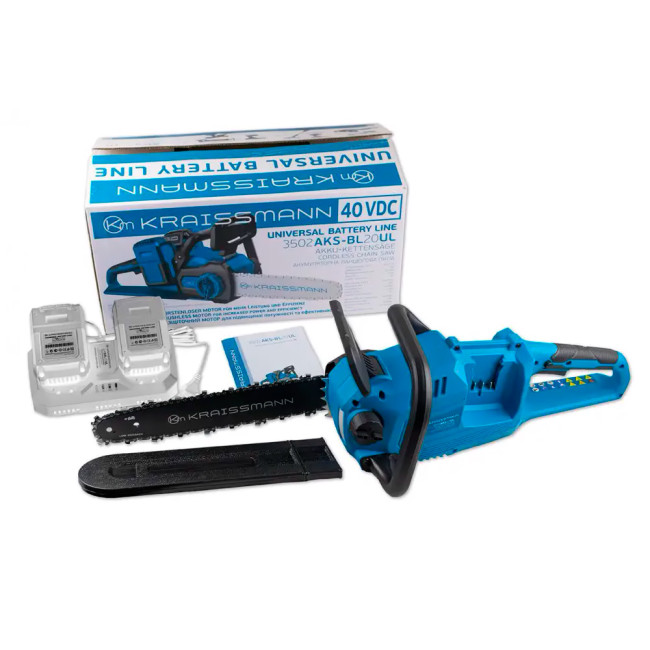 Акумуляторна пилка Kraissmann 3502 AKS-BL 20UL поставляється в комплекті з двома літій-іонними батареями сумарна напруга яких становить 40 вольт, при цьому ємність досягає 4000 мАг. При цьому Ви зможете впевнено працювати на одному заряді понад 45 хвилин.
