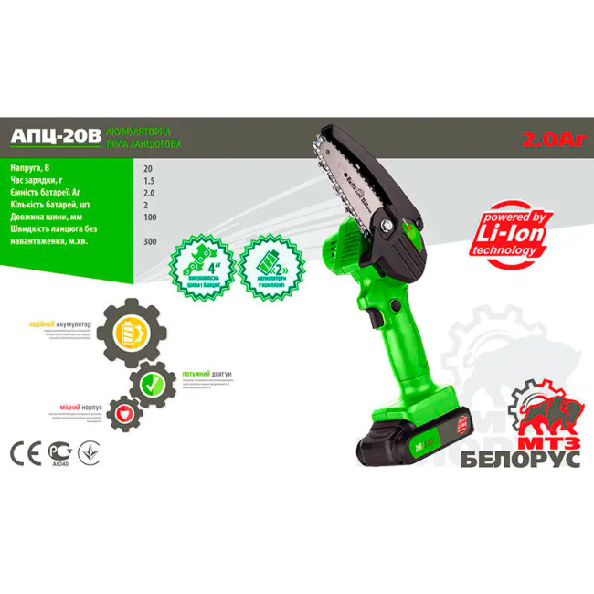 Акумуляторна ланцюгова пилка Білорус МТЗ АПЦ-20В оснащена шиною довжина якої становить 100 мл, крок ланцюга становить 1/4 дюйма. Передбачено підсвічування робочої зони, що дозволяє працювати у важкодоступних місцях. Висока швидкість обертання ланцюга досягає 300 м/хв і дозволяє підвищити ефективність розпилювальних робіт.