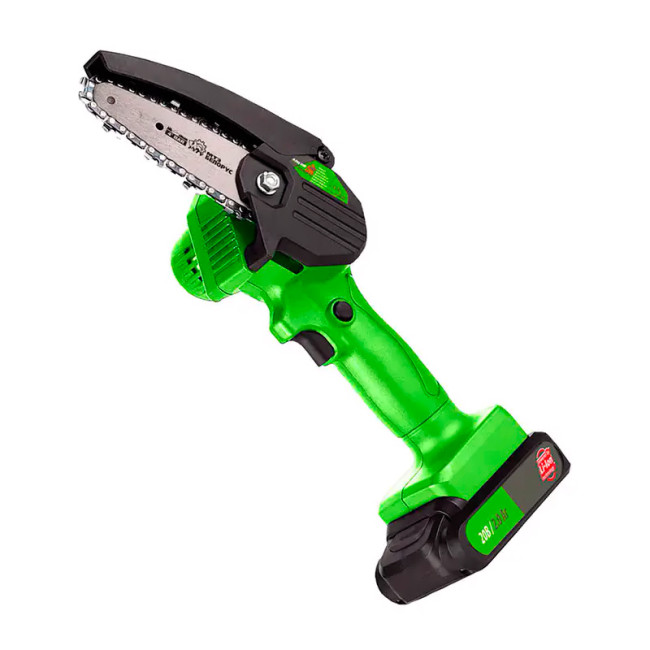 Ланцюгова міні пила має невеликі габарити і живиться від акумуляторної батареї нового покоління напруга якої становить 20 вольт, при цьому ємність становить 2,0 Ач. Час зарядки становить не більше 1,5 години, в комплекті поставляється 2 акумулятори, що дозволяє Вам завжди бути готовим до роботи.
