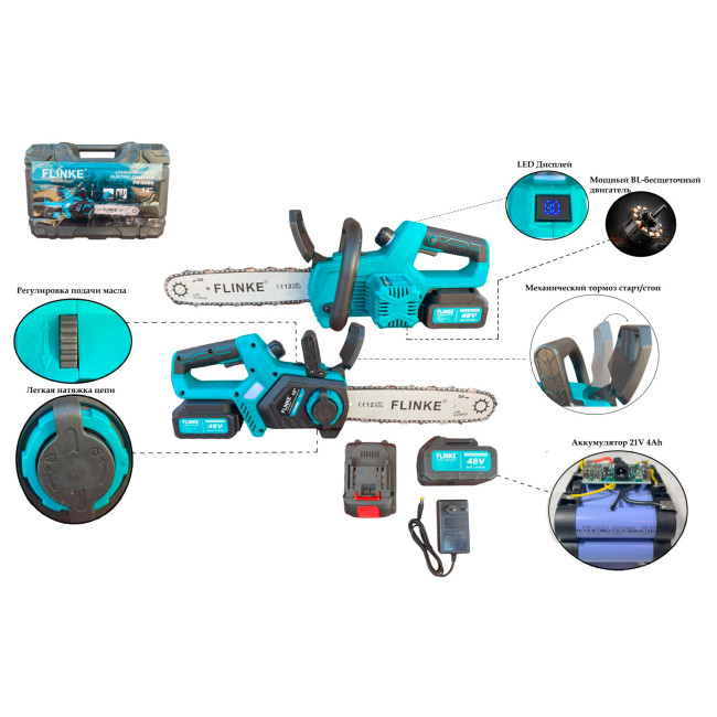 Пила ланцюгова FLINKE FK-8080 48v має безщітковий двигун і працює від літій-іонного акумулятора нового покоління напруга якого становить 48 В, при цьому ємність батареї дорівнює 4,0 Ач.